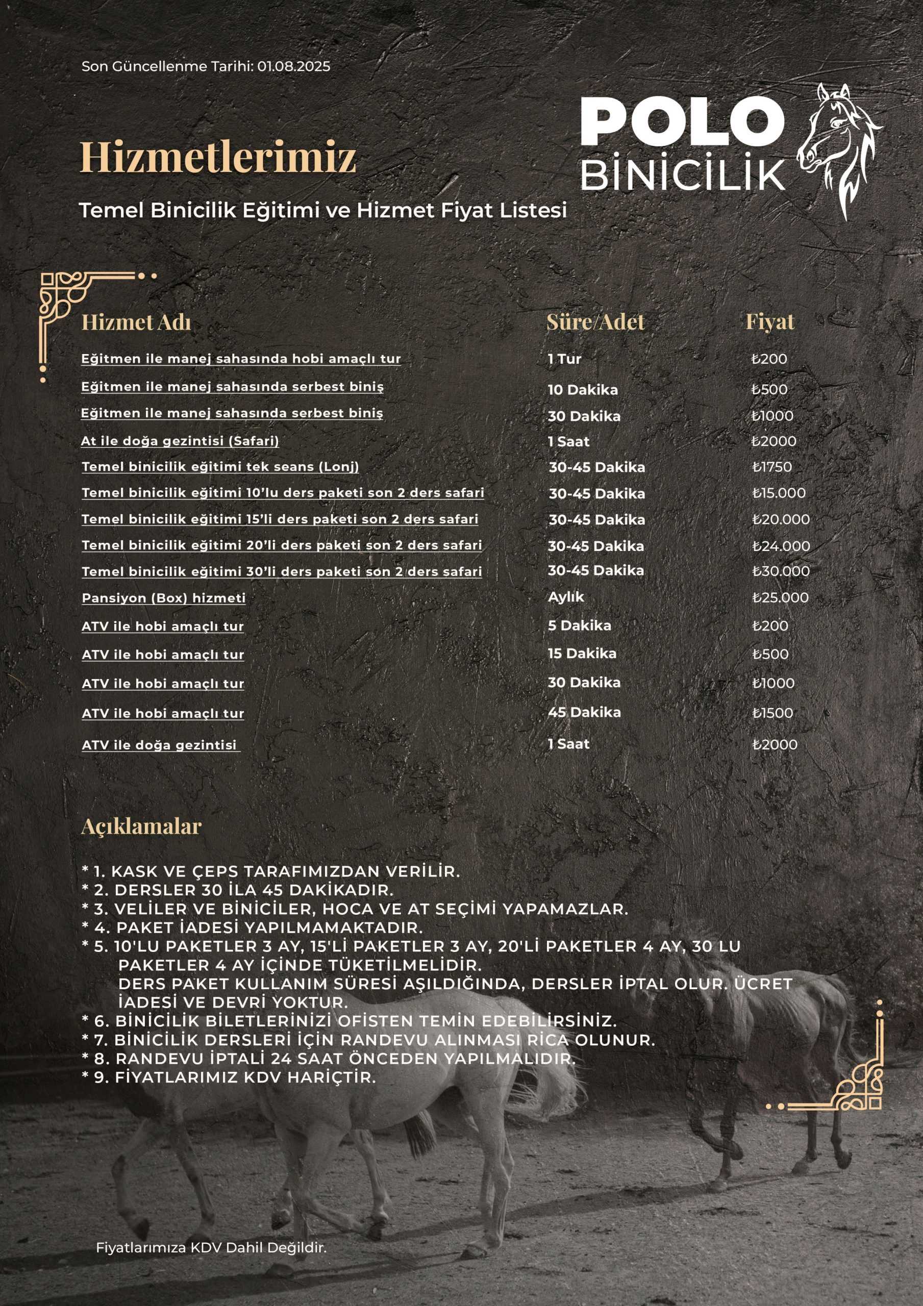 Paket ve rota tercihinize göre farklılık gösterebilir. Menümüz üzerinden seçeneklere erişebilirsiniz. Polo Binicilik ile iletişime geçerek de bilgi sahibi olabilirsiniz.